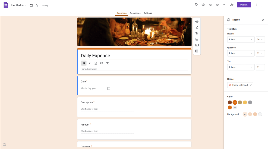 ต่อมา เราจะปรับหน้าตา Form ให้เข้ากับสไตล์ของตัวเอง เริ่มจากกดที่จานสีด้านบน โปรแกมจะโชว์แถบด้านขวาให้ตกแต่ง Form