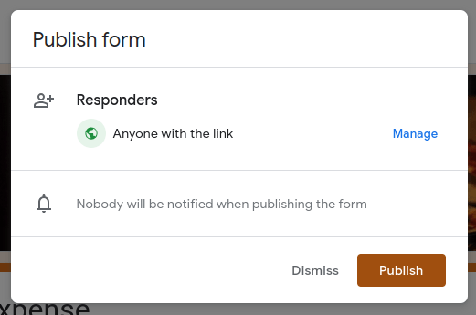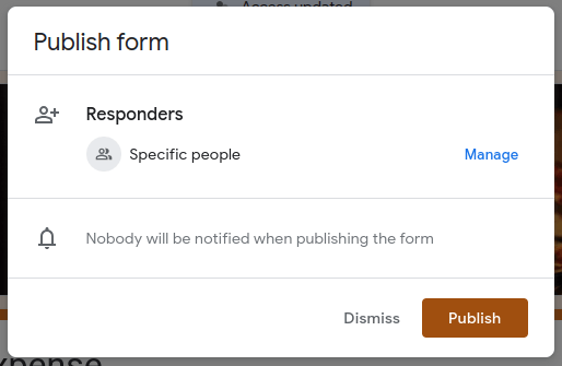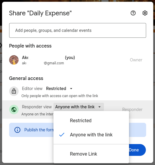 เมื่อตกแต่งเรียบร้อย ให้กดปุ่ม Publish ตัว Google Form จะแสดง Popup ขึ้นมาให้เลือกว่าใครจะสามารถกรอกฟอร์มนี้ได้บ้าง