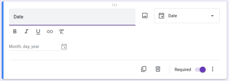 เริ่มต้นด้วยการตั้งชื่อแบบฟอร์ม จากสร้าง field วันที่ สามารถกด Dropdown ที่อยู่มุมขวาบนของแต่ละข้อเพื่อเปลี่ยนประเภทการเก็บข้อมูลได้ เราจะเลือกเป็น Date