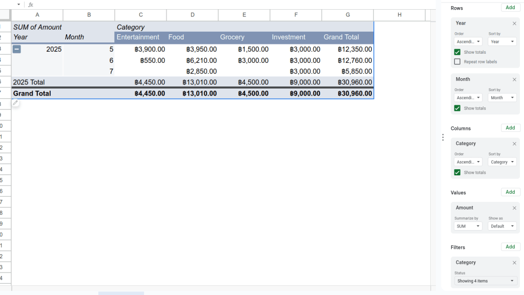 เริ่มจากดูการใช้จ่ายรายเดือนว่าใช้ไปเท่าไหร่ ลากคอลัมน์ที่ชื่อ Year และ Month มาไว้ในช่อง Rows ตามลำดับ ลาก Amount ไว้ช่อง Values และลาก Category ไว้ช่อง Filter เพื่อกรองเฉพาะรายจ่าย และช่อง Column เพื่อแบ่งประเภทการใช้จ่าย