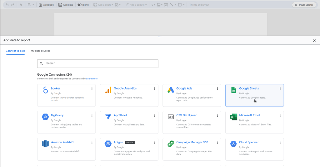 หลังจากนั้นเราต้องเชื่อมข้อมูลรายรับ-รายจ่ายเข้ากับ Looker Studio โดยการเลือก connector เป็น Google Sheet