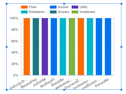 เพียงเท่านี้เราก็จะได้ 100% Stacked Bar Chart การใช้จ่ายแบ่งประเภทรายสัปดาห์เป็นที่เรียบร้อย และยังสามารถเพิ่มการแสดงผลในเดือนอื่นๆ เมื่อเพิ่ม Date Range Control ในเครื่องมือ Add a control ตั้งค่าแสดงผลเป็นเดือนปัจจุบัน