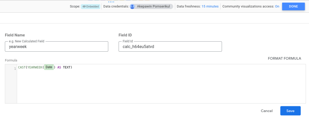 จากนั้นตั้งชื่อ field ใหม่ว่า yearweek และพิมพ์ในช่อง formula ว่า CAST(YEARWEEK(Date) AS TEXT) จากนั้นกด Save คำสั่งที่พิพม์เข้าไปจะเปลี่ยนวันที่ไปเป็นเลข ปี-สัปดาห์ เพื่อระบุเลขสัปดาห์ของแต่ละการใช้จ่าย