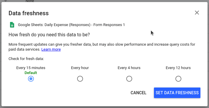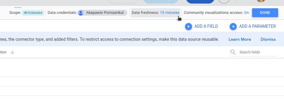 Looker Studio เปิดให้ผู้ใช้งานสามารถอัพเดตข้อมูลอัตโนมัติได้ถี่สุดถึงทุกๆ 15 นาทีทั้งนี้สามารถปรับให้ช้าลงกว่านี้ได้ขึ้นอยู่กับความสะดวกของผู้ใช้งานแต่ละคน เมื่อเลือกช่วงเวลาได้แล้วกดที่ Set Data Freshness เพื่อบันทึกช่วงเวลาที่เลือก
